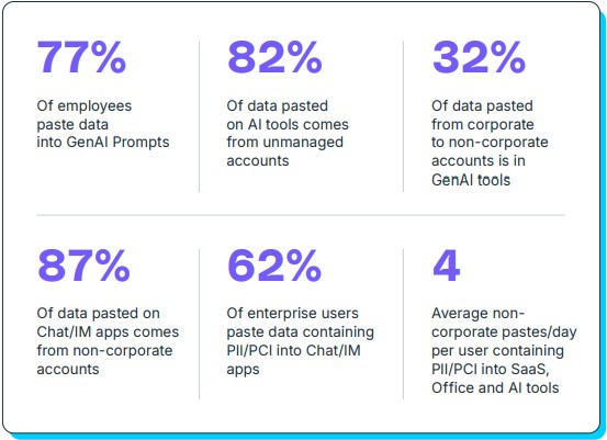 אבל העניין המהותי יותר הוא לא אם העובדים משתמשים בבינה, אלא איך הם משתמשים בה, כי בזמן שאתם עדיין מתכננים איך לאכוף שימוש בכלי AI מאושרים, הדאטה כבר דולף בדלת האחורית. 77% מהמשתמשים מעתיקים ומדביקים מידע (טקסט, קוד, שמות לקוחות) לתוך כלי AI, ורוב מוחלט מהפעולות האלה נעשה דרך חשבונות פרטיים של העובדים. זה אומר אפס ניהול, אפס נראות ואפס שליטה ארגונית על המידע הרגיש. במקביל, גם בפלטפורמות SaaS רגילות המצב לא מזהיר – 41% מהקבצים שמועלים מכילים נתונים רגישים.
