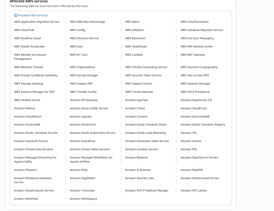 על פי הדשבורד של AWS, יותר מ-20 שירותים שונים לא היו זמינים היום, בהם AWS Config, AWS Global Accelerator, AWS IAM Identity Center, AWS Identity and Access Management, AWS Private Certificate Authority, AWS Secrets Manager, AWS ועוד.