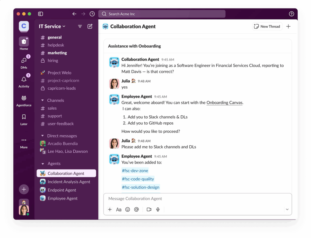 הרעיון הוא פשוט: להעביר את האינטראקציה הראשונית עם התמיכה לכלים המוכרים כמו Slack או Teams, שם סוכני ה-AI יוכלו לקחת על עצמם את רוב המשימות השגרתיות. הסוכנים מטפלים במענה על שאלות בסיסיות, פתרון תקלות פשוטות, ואפילו בדיקת זכאות מותאמת אישית על בסיס מדיניות החברה, למשל למחשב חדש. המערכת גם כוללת גישה יזומה (פרואקטיבית) במקרה של תקלת רוחב קריטית, Agentforce יודע לזהות מי מושפע, לשלוח עדכונים ולפתוח קריאה יזומה בשמם כדי להתחיל את הטיפול, עוד לפני שהם פנו לדסק.
