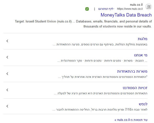 כחלק מההשתלטות על האתר ולאחר השחתתו, הקבוצה פרסמה למכירה נתונים שלטענתה אספה מתוך האתר לצד ההודעה: "ביום השנה הקודר ל-7 באוקטובר – היום בו התנפצה אשליית הניצחון של ישראל", כך כתבו חברי קבוצת MoneyTalks, שהוסיפו כי "פרצנו לאתר של התאחדות הסטודנטים הארצית (nuis.co.il), הגוף שלכאורה מייצג כ-400,000 סטודנטים במכללות, באוניברסיטאות ובקמפוסים בכל רחבי ישראל".