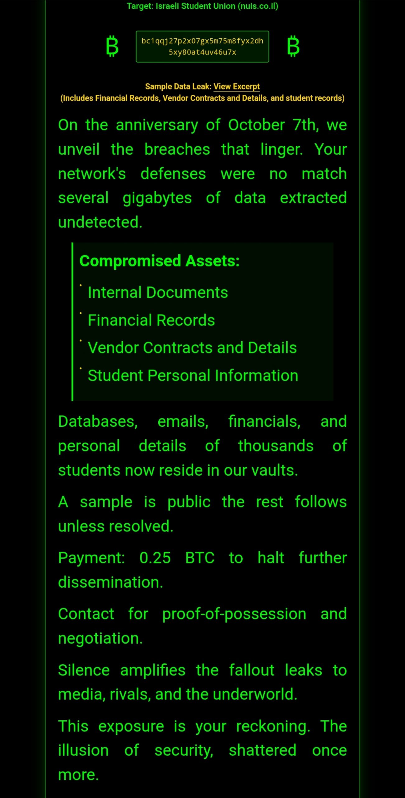"הנתונים שלכם? עכשיו הם שלנו. מסמכים פנימיים, רישומים כספיים, חוזים עם ספקים, ופרטים אישיים מלאים של אלפי סטודנטים – כתובות אימייל, תעודות זהות, כתובות מגורים – הכול. שלפנו 132 אלף שורות מכל טבלה במסד הנתונים שלהם, והשארנו פתק כופר מנומס במערכת הפיננסית שלהם, כתזכורת. תשלמו – או שההדלפות יתרבו".